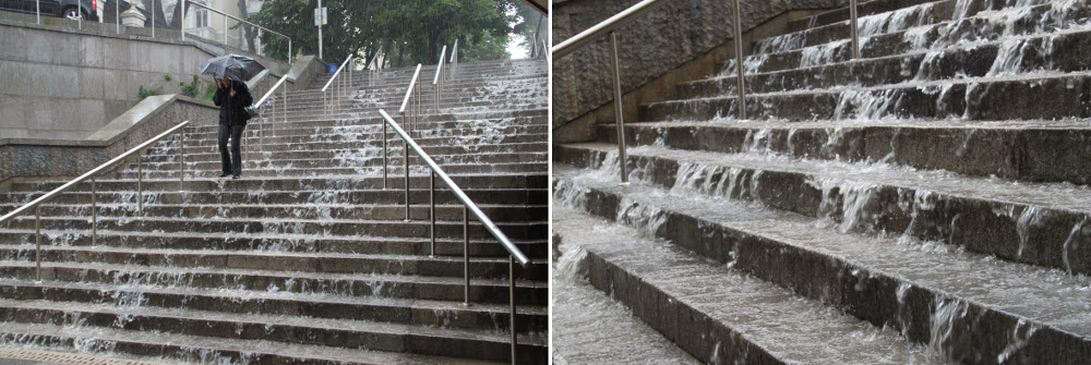 És metrózgattam egyet a pestiekkel megegyező szerelvényeken. Elmetróztam nyugat felé, majd vissza az egyetemi megállónál szálltam le. Az itteni központi tourinform irodában tárgyaltam, kaptam ingyen Vitosa turistatérképet is, aztán 100 %-os bolgár málnalevet ittam, majd még bementem a könyvesboltba is mert esett és esett és esett. A megállóban fotóztam a lépcsőn leömlő vizet.