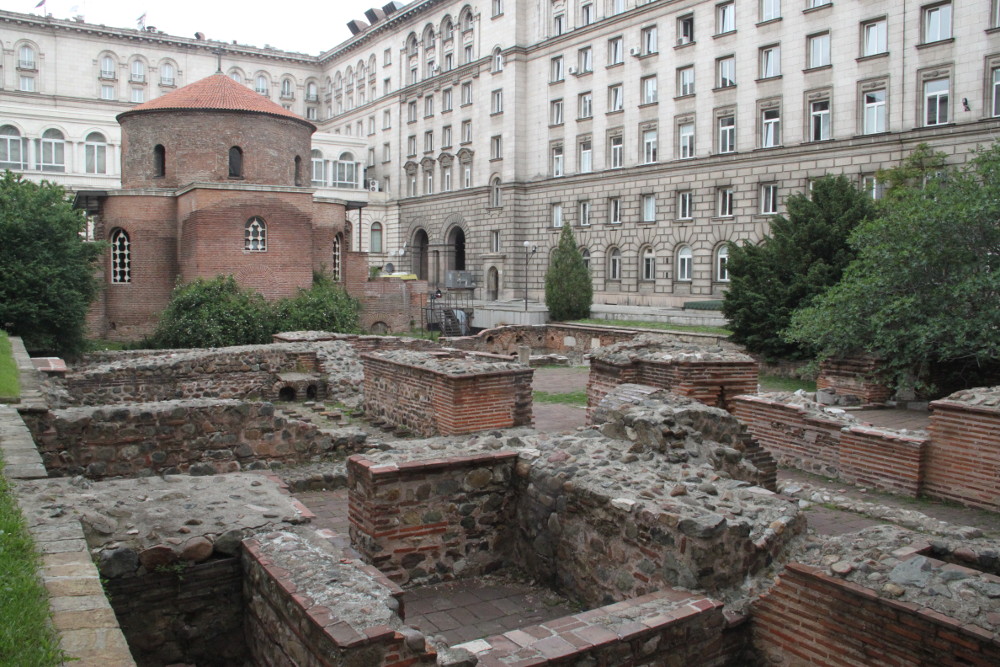 Aztán bementem az elnöki palota és a Balkán Szálló udvarára, ahol Szófia egyik leghíresebb műemléke, a Szent György-rotunda (carkva Szveti Georgi) áll. Valószínűleg eredetileg a rómaiak körbástyának építették a III. században vagy a IV. század elején.