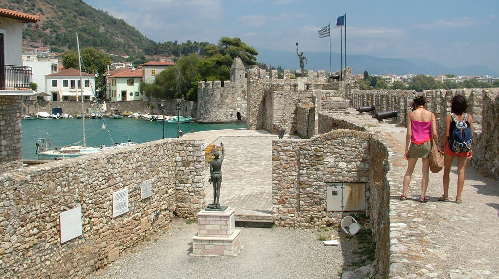 Az egykori Lepanto, a mai Nafpaktosz kis kikötői medencéjét ma is velencei falak őrzik, itt emeltek Cervantesnek egy szobrot; mögötte rengeteg emléktábla, spanyolul, horvátul, olaszul, németül, mind lefotóztam, s csináltam olyan fotót is, hogy a spanyol író integet egy másik bronzszobornak, a mólóbástya tetején álló görög szabadságharcosnak.
