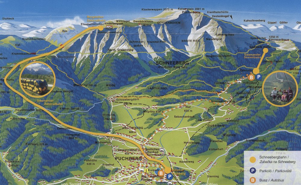 Puchbergből az év nyáriasabb részében, májustól szeptemberig fogaskerekű kisvasút (a híres Salamander) visz fel 1795 m magasra, a Hochschneeberg állomáshoz. Innen másfél óra túra a Kaiserstein (2061 m) és az Alpengipfel (2075 m).