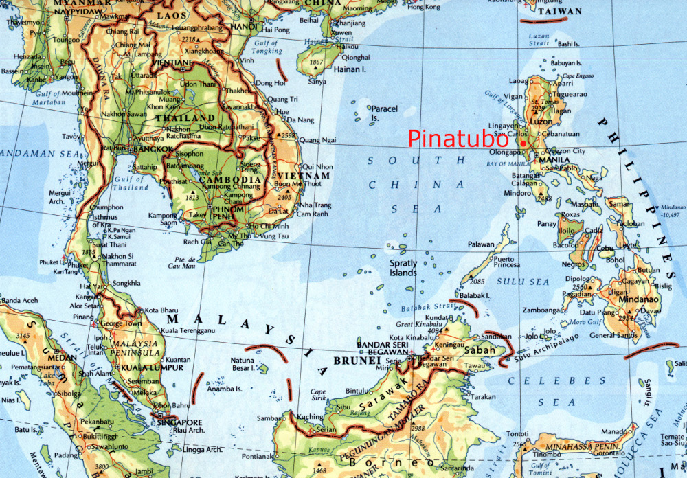Szóval a mintegy fél évezrede szunnyadó Pinatubo vulkán működéséről nem nagyon volt semmiféle történelmi feljegyzés. Nyugodtak is voltak az emberek, olyannyira, hogy a békésnek és nyugodtnak gondolt hegy mellé az amerikaiak két nagy katonai támaszpontot is építettek. Sőt, Németh Géza geográfus írta egy cikkében, hogy korábban a Pinatubót olyannyira nem jegyezték, hogy még egy elég részletes National Geographic térképen sem ábrázolták 1986-ban.