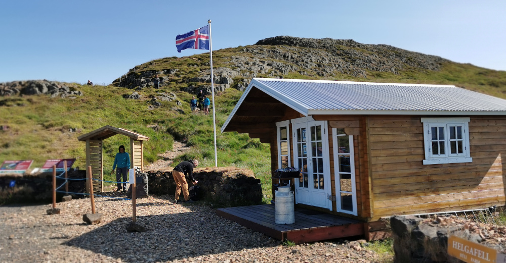 Thor templomán kívül egy kis bronzplakettet is találunk a csúcson. És fantasztikus kilátást. A Helgafell tetejéről fotóztam egyszer kedvenc izlandi zászlós képemet. Apropó zászló: Izland mai jelképét 1915. június 19-én fogadta el a reykjavíki parlament. A magyarázatok szerint a zászló keresztjének vörös színe az ország működő vulkánjait idézi, míg a fehér szín az Izland nagy részét borító gleccsereket és havat jelképezi. A háttér kék színe pedig az Atlanti-óceán vizét reprezentálja.