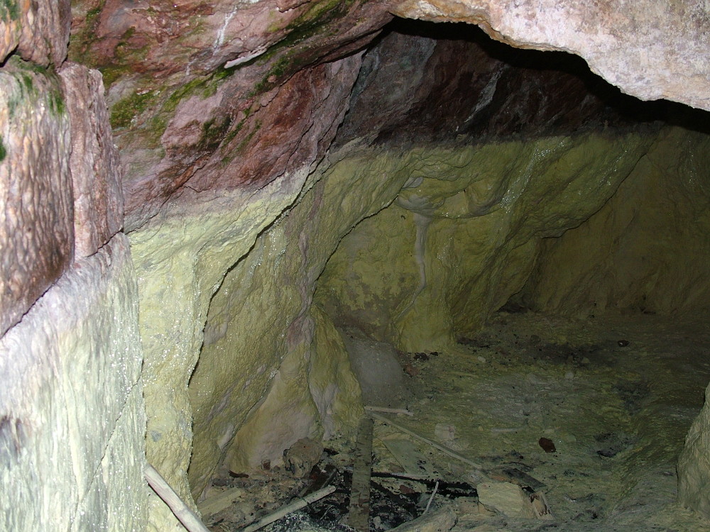 A 14 m hosszú barlang (mely tulajdonképpen nem természetes úton jött létre, hanem egy régi kénbánya felhagyott tárnája) napi gázhozama ma 4000 köbméter. Az 1800-as évek végén az ólomcsöveken elvezetett gázkeverékből napi 150 kg szénsavat állítottak elő az innen négy kilométerre épült első magyar szénsavgyárban (1892). Ekkor, 1892-ben faragott andezitkockákkal bélelték ki a boltozatot is, amit mindmáig láthatunk.