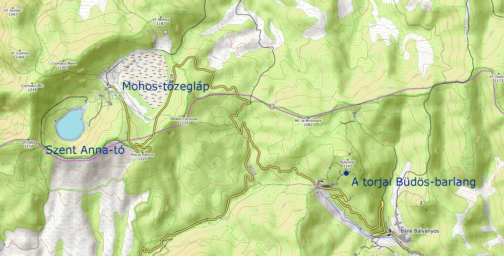A hotel mögött emelkedő Büdös-hegyre (1143 m) a piros pont jelzésű körtúra-útvonalon indulhatunk el. Túránk helyszínéről, a Csomádtól keletre elterülő Büdös-hegycsoportról (Muntele Puturosul) azt érdemes tudni, hogy ez a Keleti-Kárpátok vulkáni vonulatának utolsó, legdélibb tagja. A Büdös-hegy tömegének zömét kréta időszaki kárpáti homokkő képezi, melynek törésvonalai mentén a pliocén folyamán andezitláva nyomult fel.