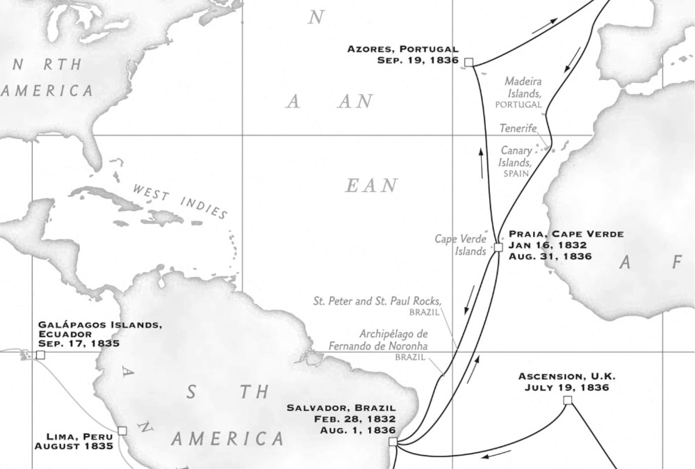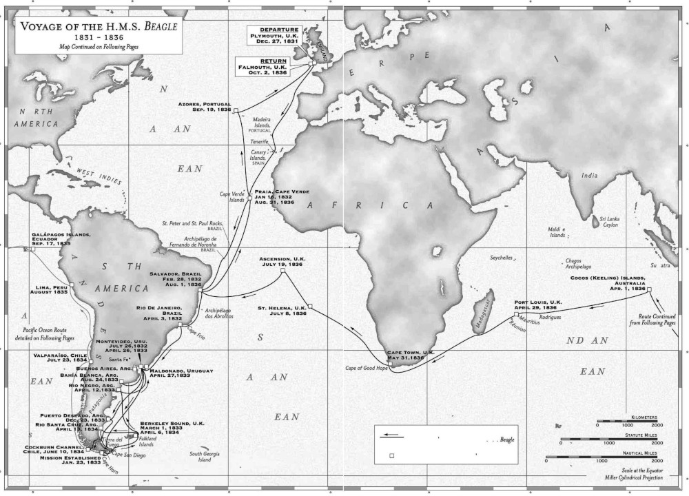 A háromárbócos, 27 méter hosszú Beagle 1831. december 27-én bontott vitorlát; Charles Darwin ekkor még 23 éves sem volt. Az öt évig tartó úton eljutottak a Zöld-foki-szigetekre, Brazíliába, Montevideóba és Buenos Airesbe, Tűzföldre, a Falkland-szigetekre, Patagóniába, Dél-Amerika nyugati partjára, a Galapagos-szigetekre, Tahitire, Új-Zélandra, Ausztráliába, a Kókusz (Keeling)-szigetekre, Mauritiusra és Fokvárosba is és visszafelé (1836 augusztus) újra a Zöld-foki szigetekre.