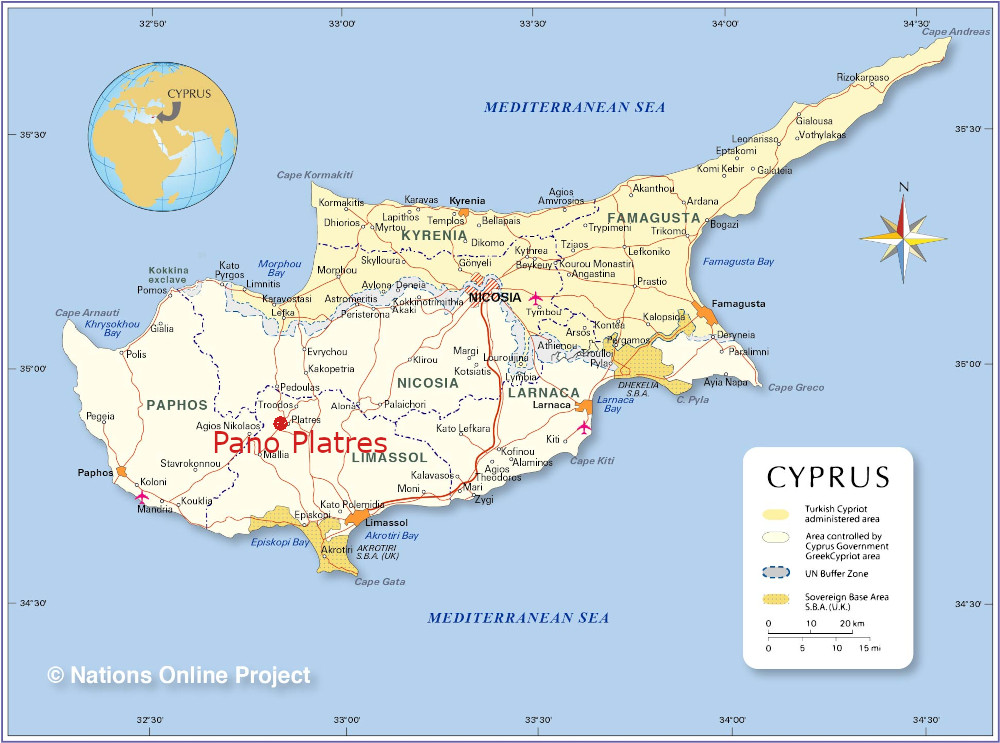 Pano Platres (Πάνω Πλάτρες) falu Limasszoltól 35 kilométerre északra fekszik (Lárnakától kicsit többet, 102 kilométert kell utaznunk érte).
