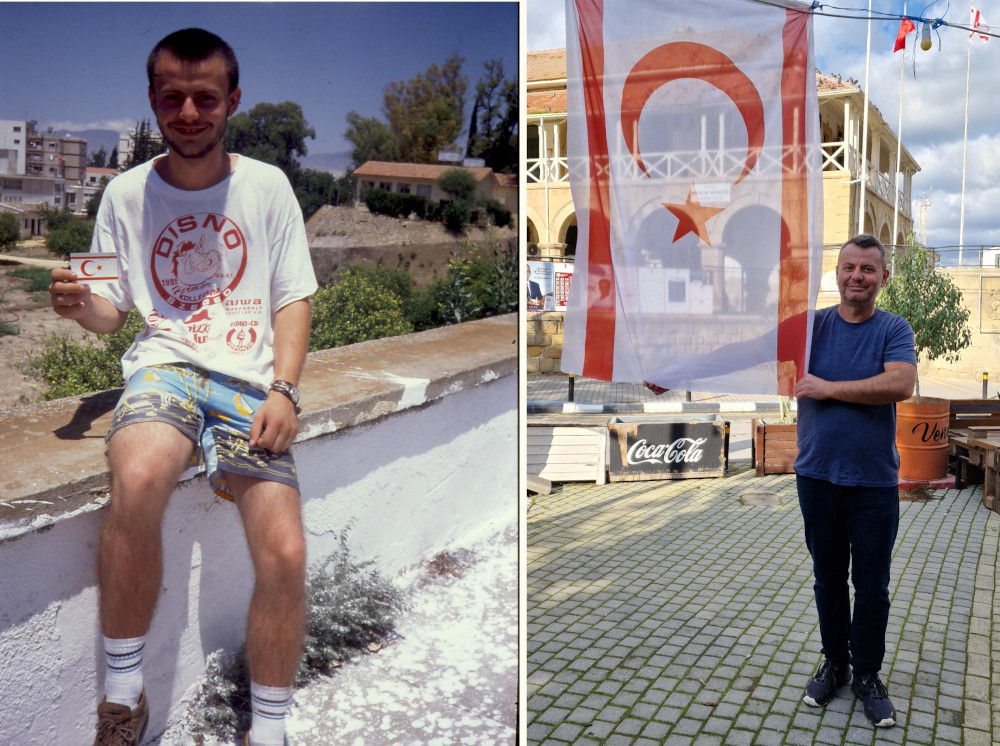 A szerző 21 évesen és 48 évesen Lefkosában, Észak-Ciprus fővárosában az ország zászlajával (1995/2022)