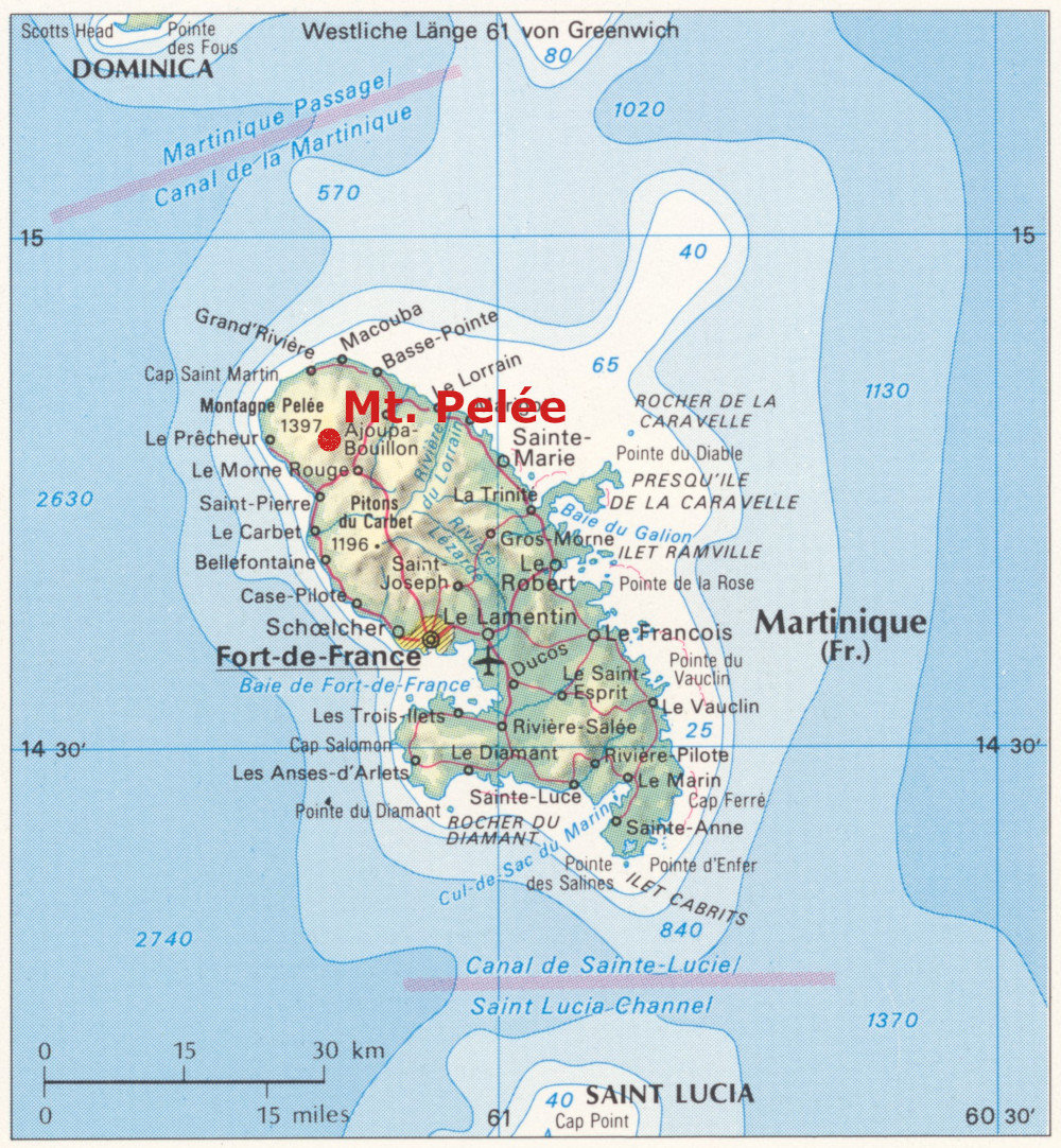 A karib Martinique szigetének legmagasabb pontja a Mt. Pelée (1397 m). Ehhez a tűzhányóhoz kapcsolódik az emberiség történetének egyik legnagyobb természeti katasztrófája: az 1902. május 8-án bekövetkezett fő kitörés következtében 30 ezer ember halt meg.