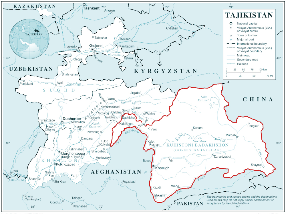 Hegyi-Badahsán területe pirossal jelölve Tádzsikisztán térképén