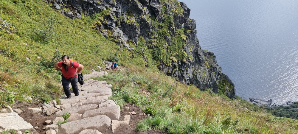 Reinétől délre, a Ramsvika öböl partjáról indulhatunk el a falu fölé emelkedő Reinebringen kilátójához. A hegyre való feljutás jó kis kardio edzés, több száz lépcső visz fel ugyanis több mint 400 méter szintet.