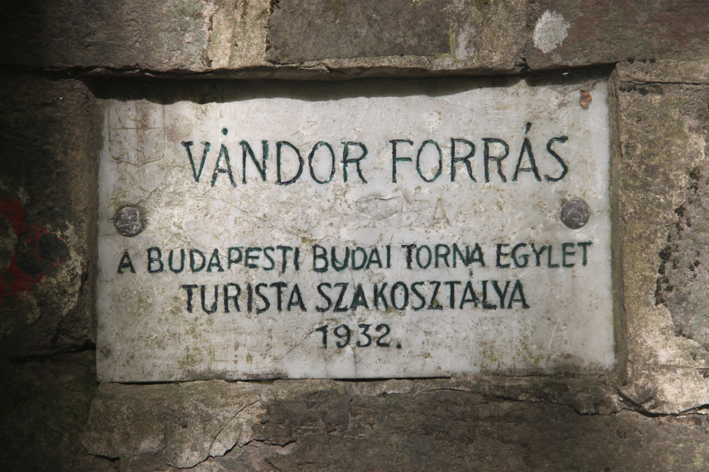 Visszatérve a forráshoz, a tehát szárazabb időszakokban is vizet adó foglalt forrás kis kővályújából kifolyó vízzel bátran tölthetjük mindig kulacsunkat, a víz friss és finom. A forráson kis márványtábla olvasható: „Vándor forrás / A Budapesti Budai Torna Egylet Turista Szakosztálya 1932”. A forrást tehát 1932. június 12-én foglalták és adták át ünnepélyesen; az átadáson a BBTE tagjain kívül több turistaegyesület, a területtulajdonosok és a környékbeli községek lakóiból is többen megjelentek. Magát az ünnepséget az MTE Salgótarjáni Osztálya, Zagyvapálfalvi Osztálya, Pásztói Osztálya, valamint a Hatvani Osztály rendezte ünnepélyesen.