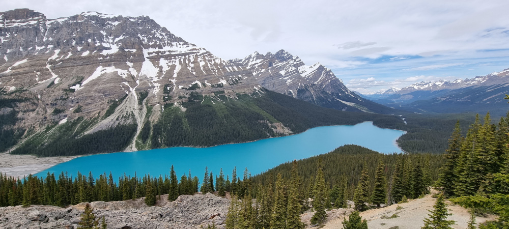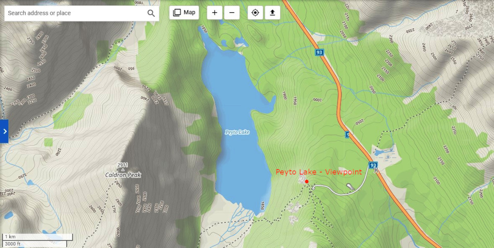 Az alsó parkolóból 600 méter, azaz mindössze negyedórányi sétával fenn vagyunk a kilátóponton (Peyto Lake – Viewpoint), ahonnan 2109 méter magasból fotózhatjuk a tavat, s a fölé tornyosuló a Caldron-csúcs (2911 m) sziluettjét.