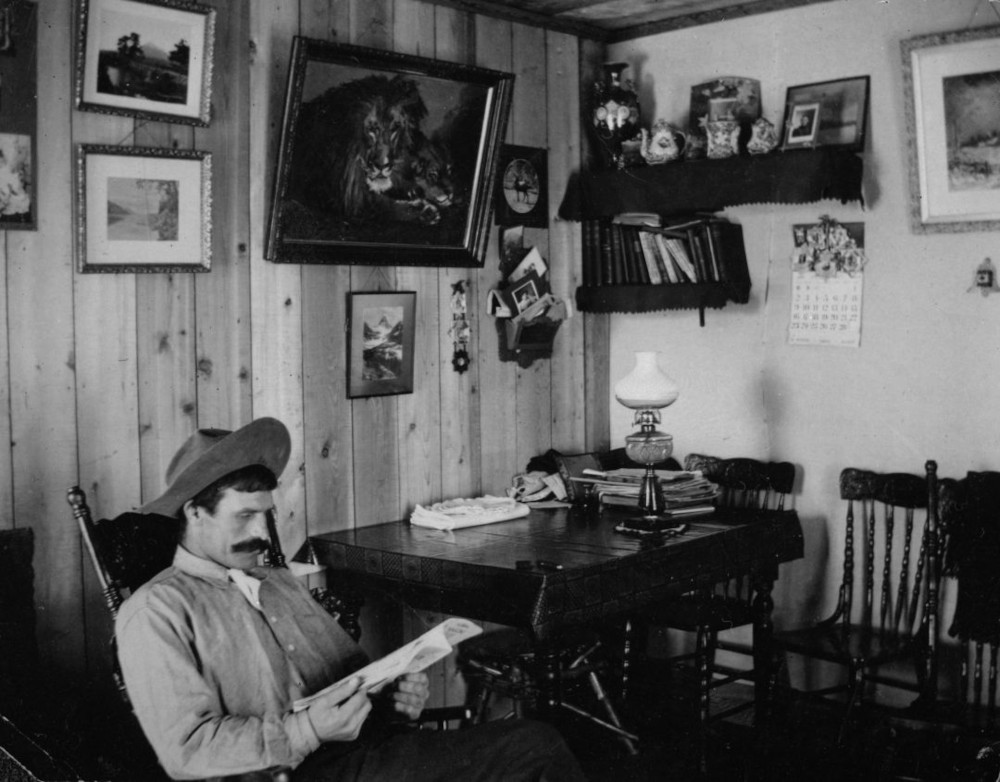 Bill Peyto olvas a házában, Banff, 1902