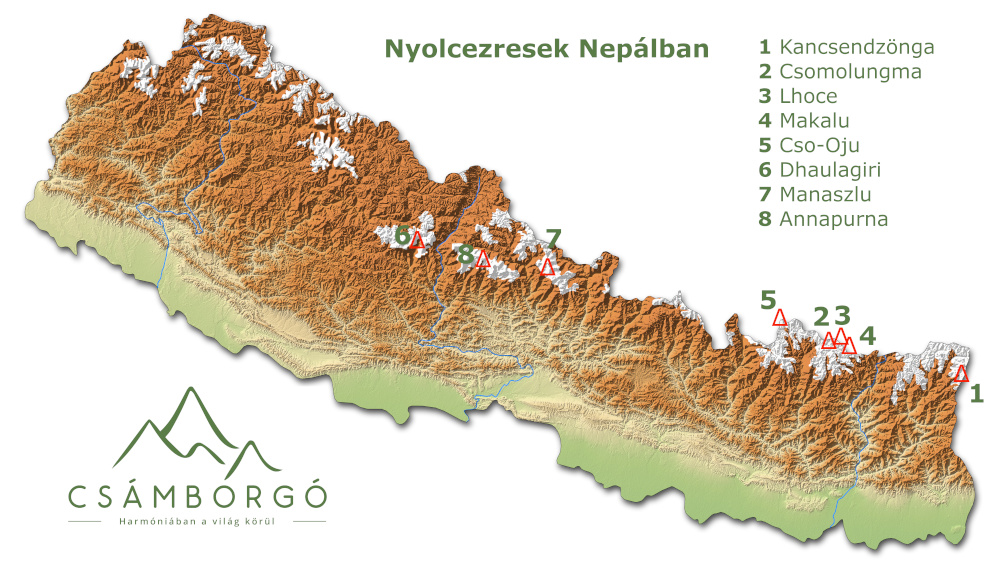 Nepál nyolc darab nyolcezresének elhelyezkedése