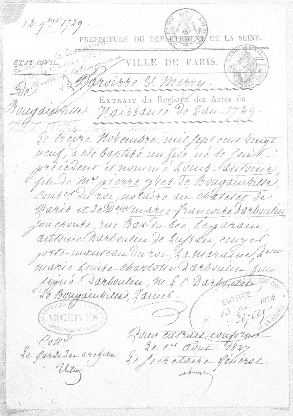 A vérhasban szenvedő Louis-Antoine de Bougainville 1811. augusztus 31-én (81 évesen) este tizenegy órakor hunyt el házában, Párizsban, a Petits- Pères utcában (a mai rue de la Banque), melyre emléktábla hívja fel figyelmünket.