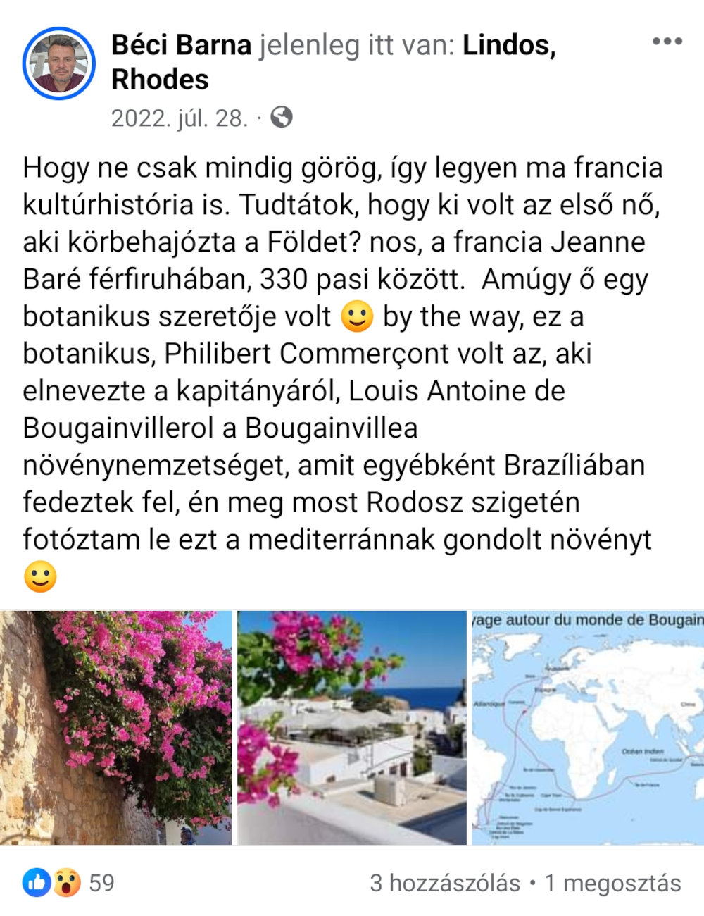 „Hogy ne csak mindig görög, így legyen ma francia kultúrhistória is. Tudtátok, hogy ki volt az első nő, aki körbehajózta a Földet? Nos, a francia Jeanne Baré férfiruhában, 330 pasi között. Amúgy ő egy botanikus szeretője volt – by the way, ez a botanikus, Philibert Commerçont volt az, aki elnevezte a kapitányáról, Louis Antoine de Bougainvillerol a Bougainvillea növénynemzetséget, amit egyébként Brazíliában fedeztek fel, én meg most Rodosz szigetén fotóztam le ezt a mediterránnak gondolt növényt”.
