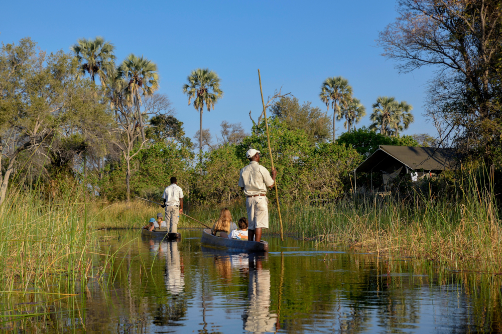 Turisták egy mokoróban, Gomoti Plains Camp, Gomoti Concession Area, Okavango-delta, Botswana