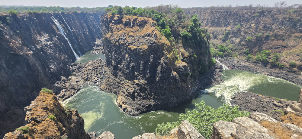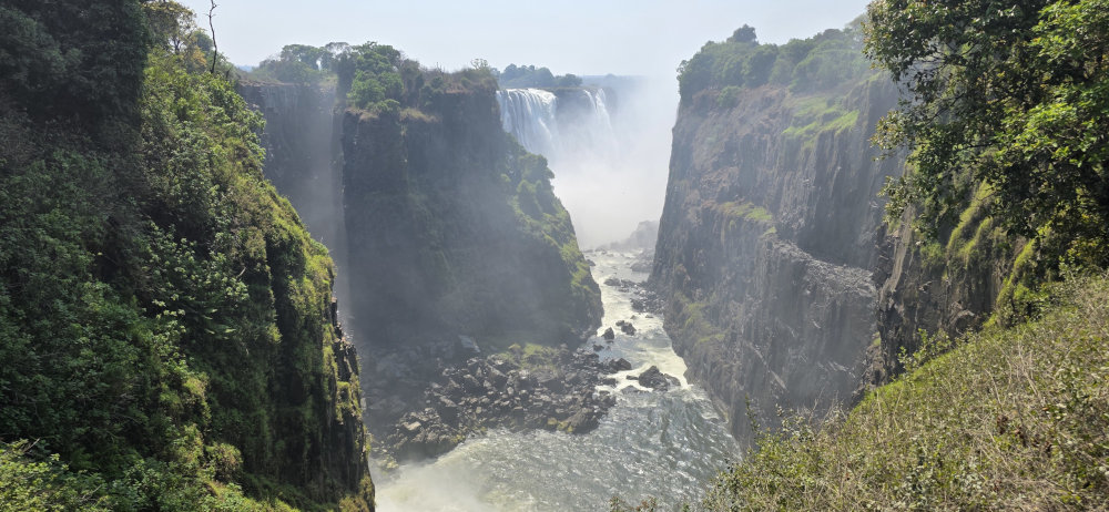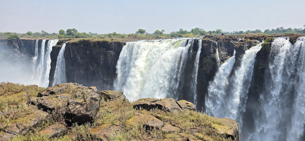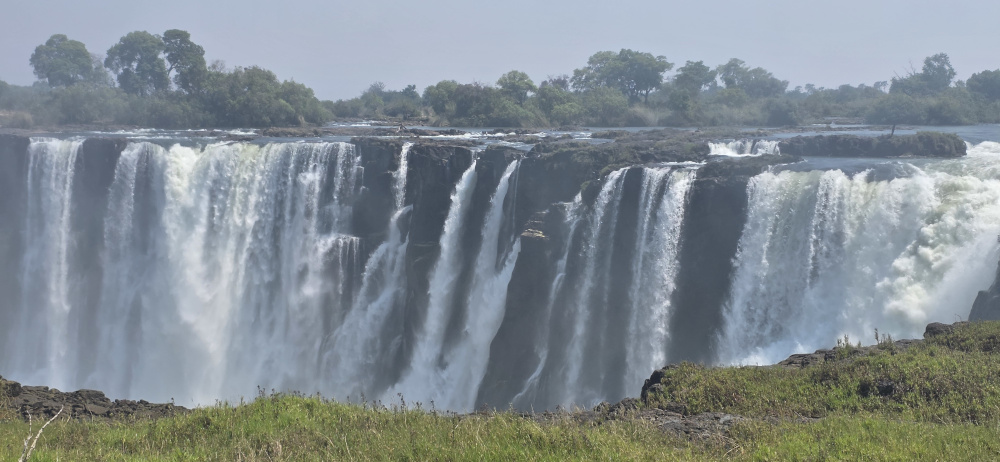 Az angol wikipédia is azt írja, hogy „a Viktória-vízesést a legnagyobb vízesésként tartják számon, mivel együttes szélessége 1708 méter (5604 láb) és magassága 108 méter (354 láb), ami a világ legnagyobb vízesés-felületét eredményezi”. Csak zárójelben jegyzem meg, hogy ugyanez a szócikk összehasonlítja a Niagara vízeséssel, mely kevésbé széles, 1203 m, de az Iguazu például szélesebb számadatilag, 2700 méteres. Na mindegy, lényeg, hogy tényleg a világ egyik legnagyobb víztömege zúdul itt le: a Zambézi átlagos vízmennyisége a vízesésnél 1400 m³ másodpercenként, de esős évszakban eléri az 5000 m³-t is. A Viktória-vízesés az átfolyt vízmennyiség tekintetében a világon a tizenegyedik helyen áll.