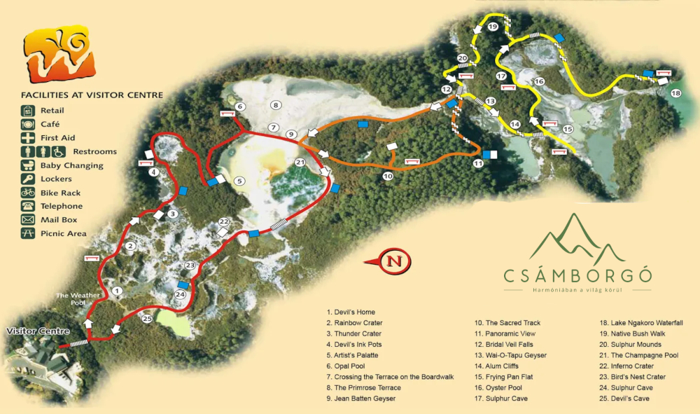 Innen a bejáratig tartó visszafelé úton érintjük még a Pokol-krátert (Inferno Crater), a Madárfészek-krátert (Bird’s Nest Crater) a Kén-barlangot és az Ördög fürdőjét (Devil’s Bath) mely szépséges színét vagy színeit a Pezsgő-medencéből kifolyó kén- és vastartalmú víz adja: a megvilágítástól függően sárga, de akár zöld színű is lehet!