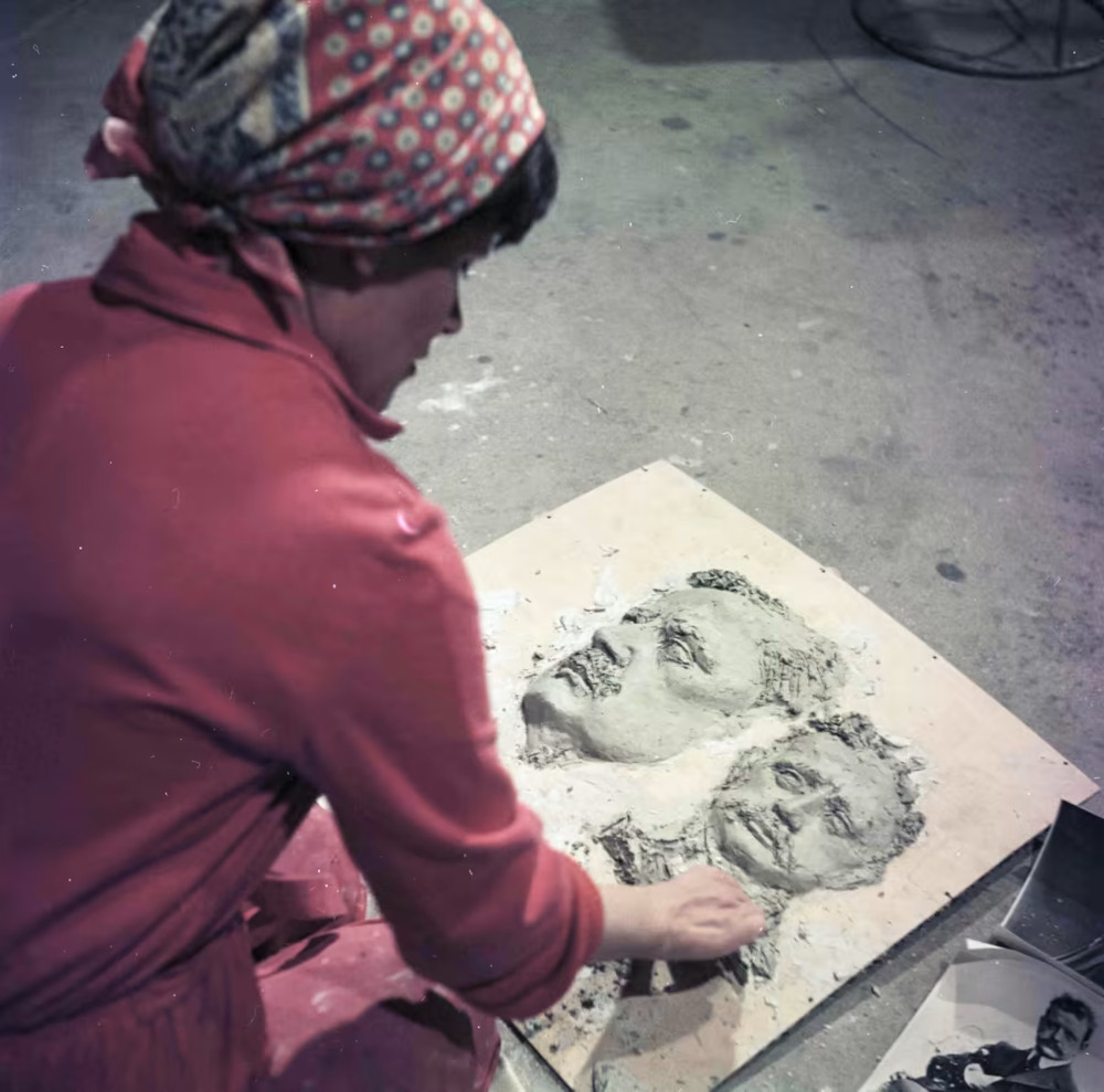 Eila Hiltunen finn szobrászművész fényképe, amint Jean Sibelius domborművét alkotja a helsinki emlékműhöz – Kép: Otso Pietinen